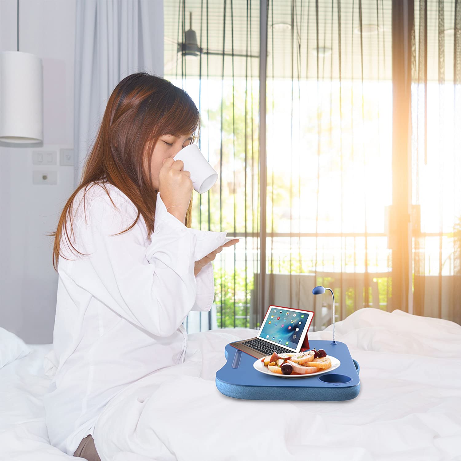 منتج مثالي يمكنك من العمل أينما كنت مزود بوسادة محشوة بالفوم ومصباح LED مع وجود مكان لوضع الأكواب أو زجاجة المياه، يمنحك المرونة أثناء الجلوس مع تقليل الإجهاد على العين يمكنك الحصول على المنتج الآن من خلال متجر جملة الإلكتروني الذي يوفره لكم بسعر مميز.