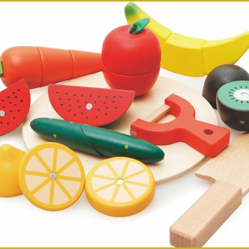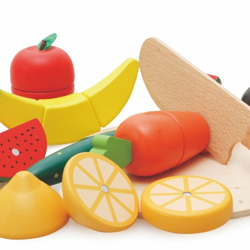 لعبة الخضراوات والفواكه مع السكينة الخشبية للتقطيع