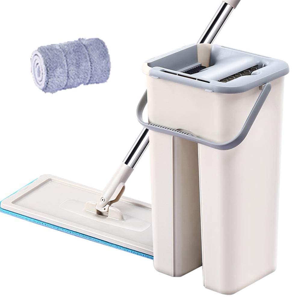 مجموعة ممسحة مسطحة ودلو للتنظيف والتجفيف، بعمود من الفولاذ المقاوم للصدأ و2 وسائد إضافية قابلة للغسل لتنظيف جميع الأرضيات